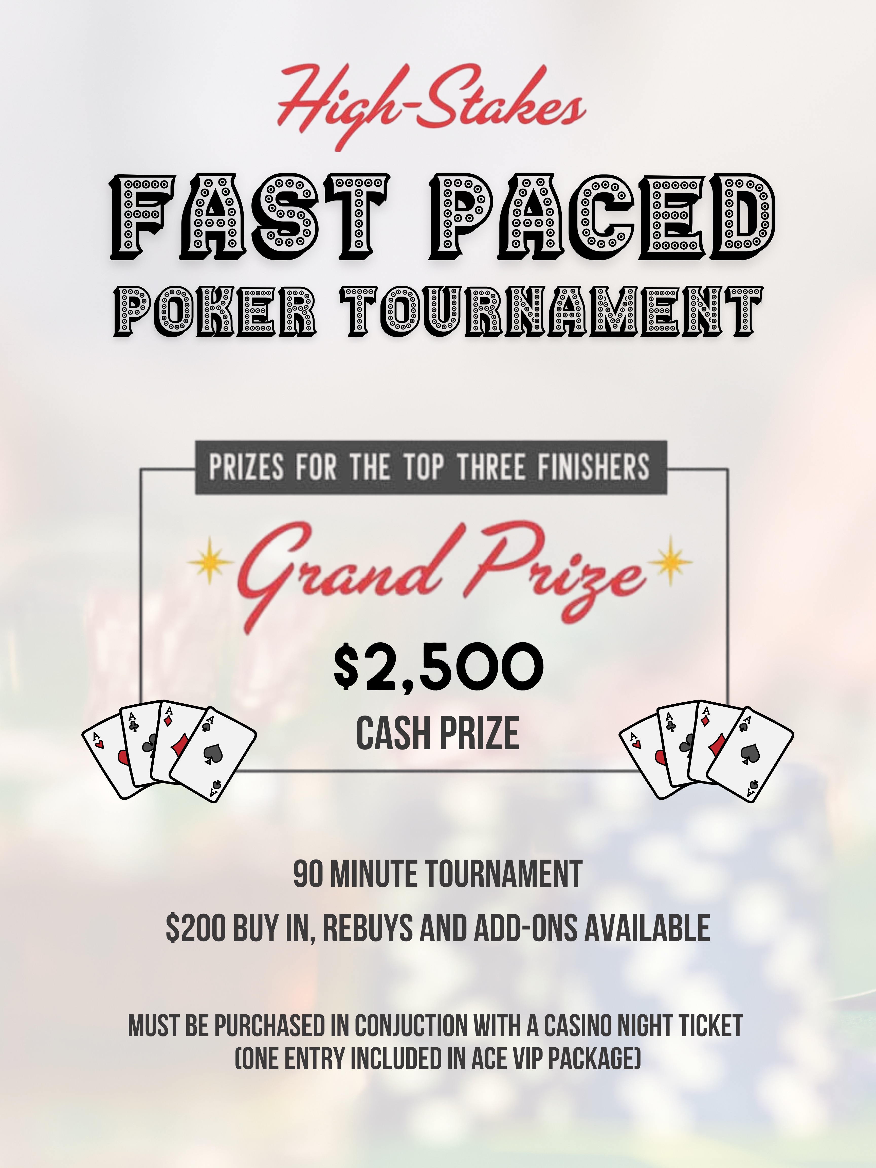 Important: Poker Tournament Entry requires a Casino Night Ticket. Be sure you've purchased your tickets or a VIP sponsorship package to attend Casino Night before purchasing the Poker Tournament Entry add-on.